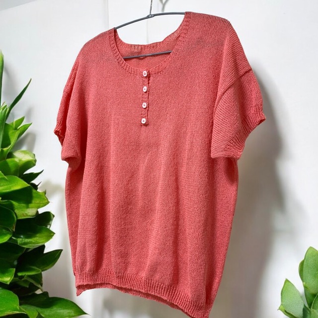 ヘンリーネックの半袖プルオーバーに なります。 白いボタンが夏らしいデザインです。 ドロップスリーブで袖ぐりが楽なデザインです。 ハリやコシがありサラサラした編み地なので ドライな肌触りです。 手編み機で編みました。 素材 レーヨン50% コットン33% リネン17% サイズ 出来上がり寸法 胸囲 112cm 着丈 58cm 裄丈 38cm ⚠️お洗濯は手洗いでお願いします。